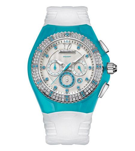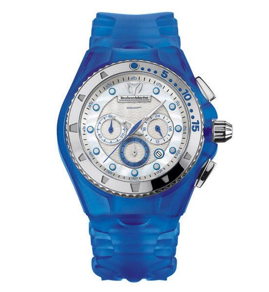 e il contatore cronografo sono blu-tinto, così come i loro secondi e